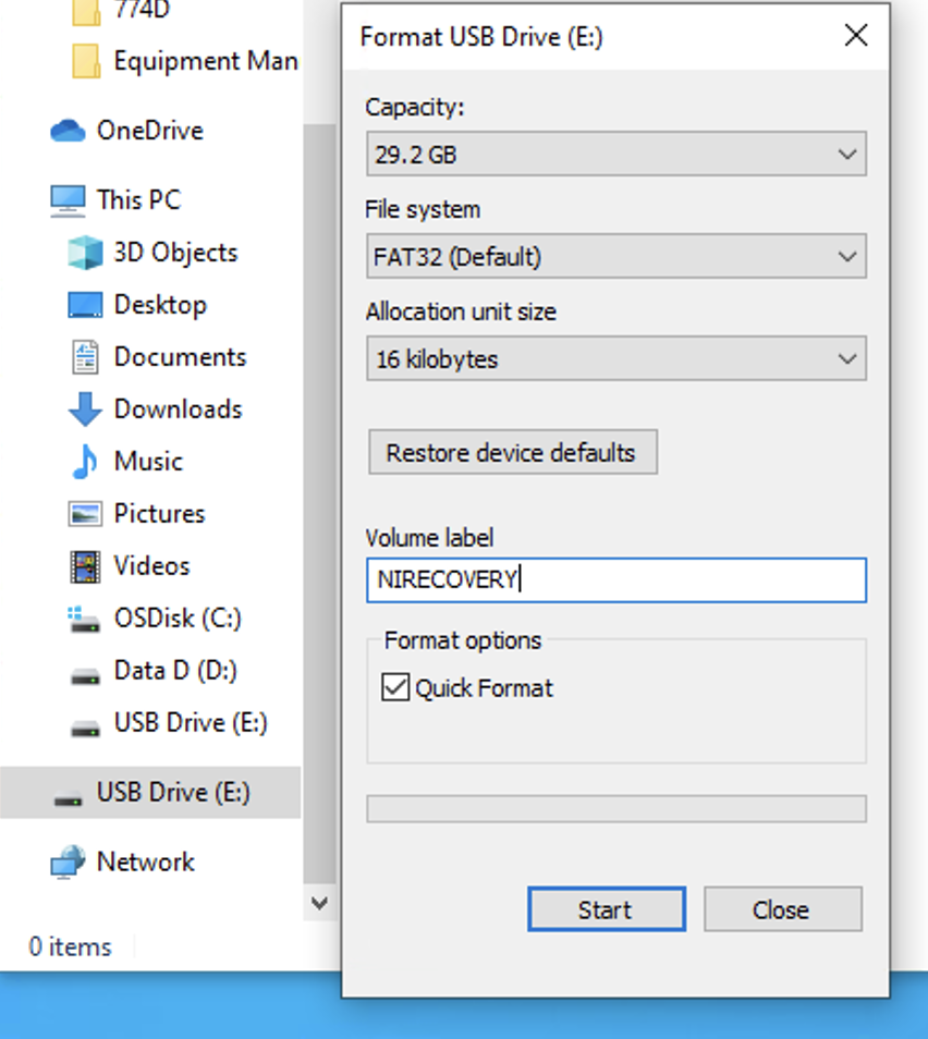 Format a USB drive with FAT32 File System and set NIRECOVERY as Volume label.